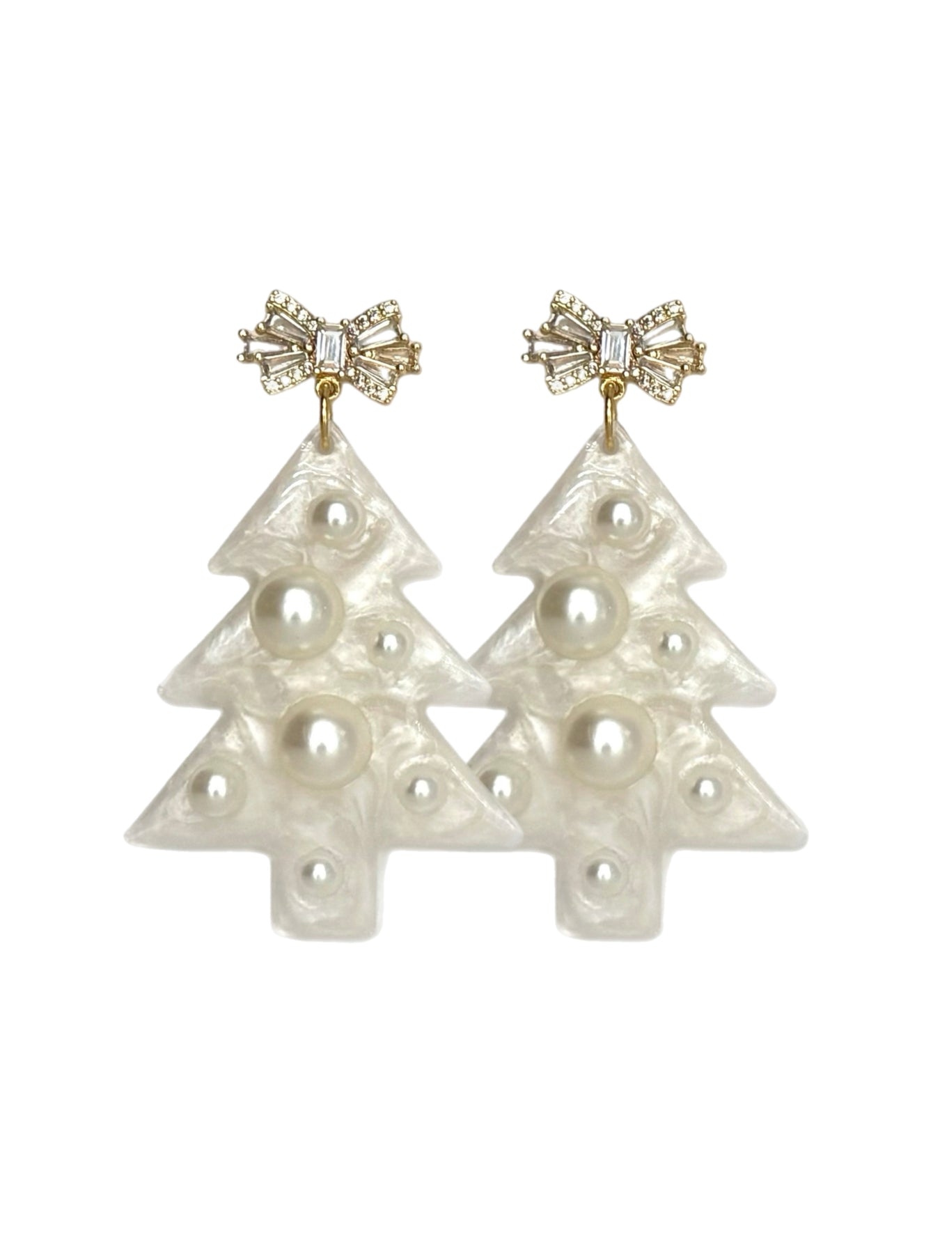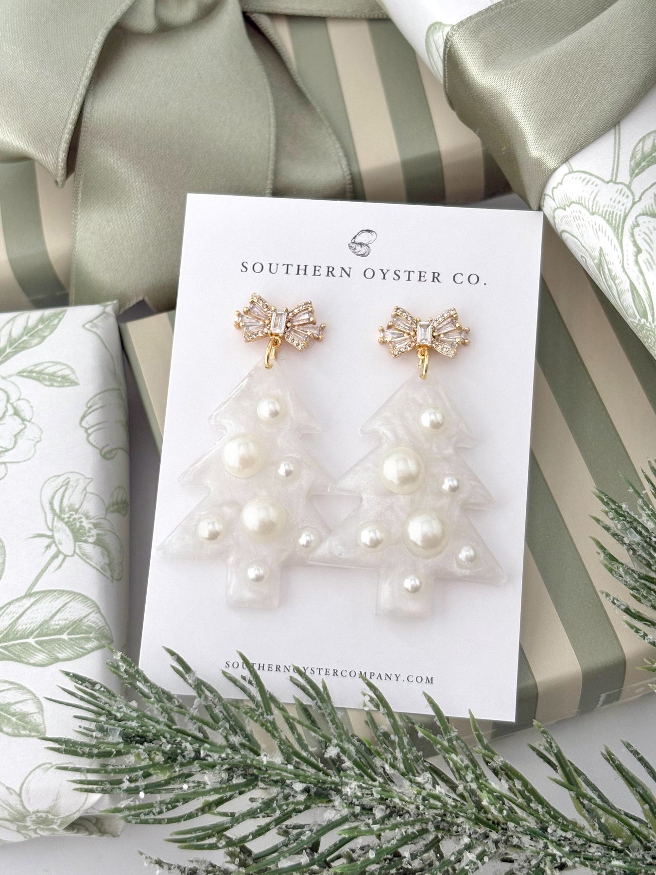 Add festive sparkle to your holiday look with these gorgeous Christmas tree earrings. Featuring a pearlescent tree adorned with multiple sized pearls and topped with a golden crystal bow stud, they’re the perfect way to add a touch of Christmas magic to any outfit. This pair is lightweight and hypoallergenic for sensitive ears.