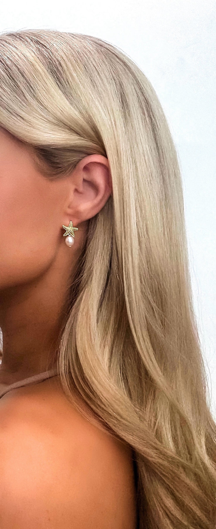 Add a touch of ocean-inspired elegance to your jewelry collection with our stunning starfish pearl earrings. Featuring an 18k gold plated starfish top and a lustrous freshwater pearl below, this earring is a must-have accessory for beach lovers! All earrings are hypoallergenic for sensitive ears.
